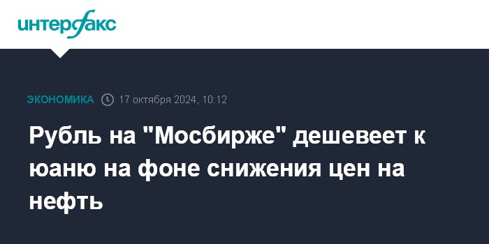 Москва. 17 октября. INTERFAX.RU - Утром в четверг на "Московской бирже" рубль дешевеет к юаню на фоне снижения цен на нефть.