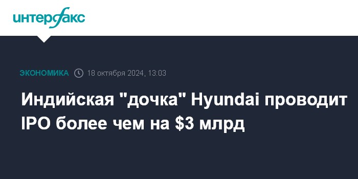 Москва. 18 октября. INTERFAX.RU - Индийское подразделение южнокорейского автопроизводителя Hyundai Motor привлечет более $3 млрд в ходе IPO, которое станет рекордным для страны.