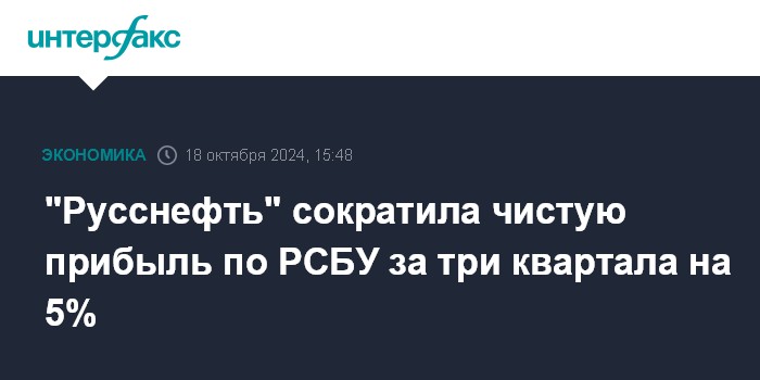 Москва. 18 октября. INTERFAX.RU - "Русснефть" за девять месяцев 2024 года получила чистую прибыль по РСБУ в размере 32,19 млрд рублей, что на 5,4% меньше, чем за аналогичный период прошлого года, говорится в отчетности компании.
