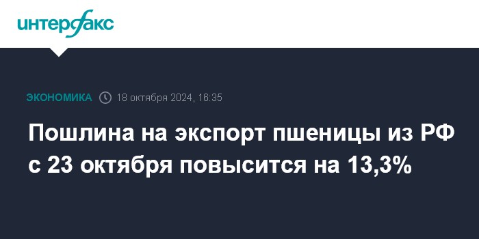 Москва. 18 октября. INTERFAX.RU - Ставка пошлины на экспорт пшеницы из РФ с 23 октября повысится на 13,3%, до 2 121 рубля за тонну.