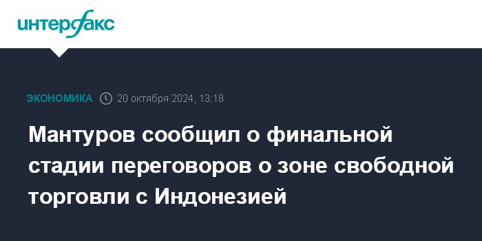 Москва. 20 октября. INTERFAX.RU - Соглашение о создании зоны свободной торговли (ЗСТ) между Евразийским экономическим союзом (ЕАЭС) и Индонезией может быть подписано в ближайшее время, сообщил первый вице-премьер РФ Денис Мантуров по итогам визита в Джакарту на инаугурацию президента страны Прабово Субианто.