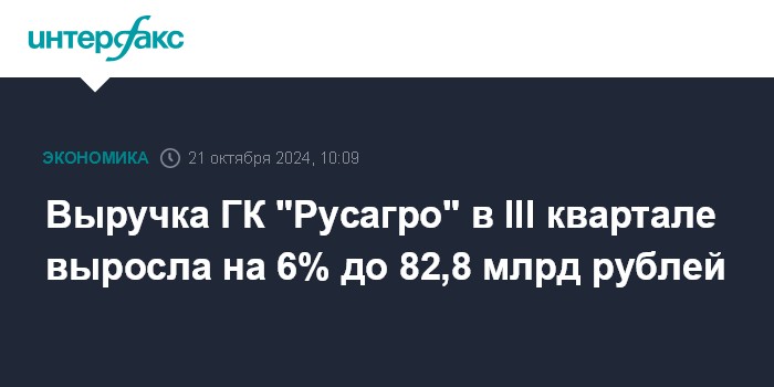 Москва. 21 октября. INTERFAX.RU - Выручка ГК "Русагро" в третьем квартале этого года составила 82,8 млрд рублей, что на 6% больше, чем за аналогичный период прошлого года, сообщает компания.