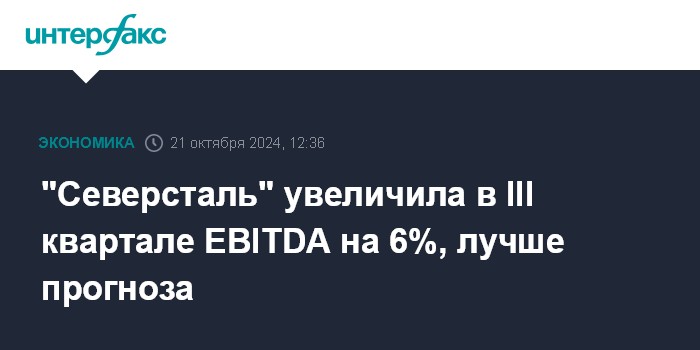 Москва. 21 октября. INTERFAX.RU - "Северсталь" в III квартале 2024 года нарастила EBITDA на 6% по сравнению со вторым кварталом, до 64,85 млрд рублей. По сравнению с аналогичным периодом прошлого года показатель упал на 9%, говорится в сообщении компании.