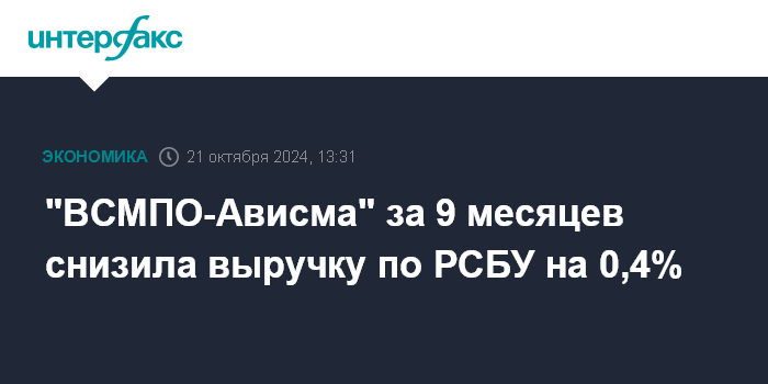 Москва. 21 октября. INTERFAX.RU - ПАО "Корпорация "ВСМПО-Ависма" в январе-сентябре 2024 года уменьшило выручку по РСБУ на 0,44% в годовом исчислении, до 72,3 млрд рублей, говорится в отчетности компании.