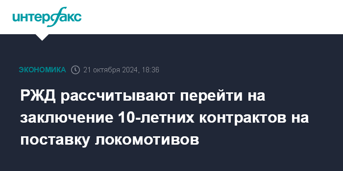 Москва. 21 октября. INTERFAX.RU - ОАО "Российские железные дороги" рассчитывает вскоре перейти на заключение долгосрочных 10-летних контрактов на поставку локомотивов, сообщил журналистам заместитель гендиректора РЖД - начальник дирекции тяги Дмитрий Пегов.