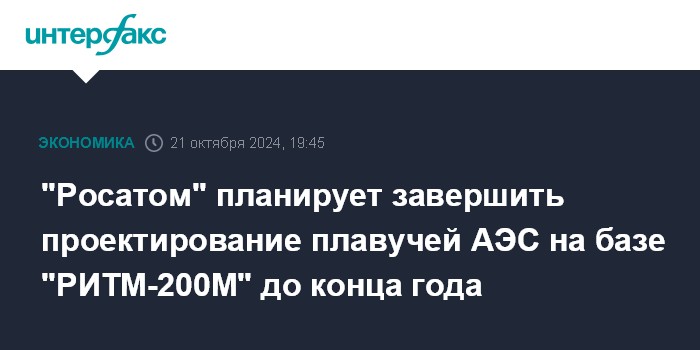 Москва. 21 октября. INTERFAX.RU - Госкорпорация "Росатом" в этом году планирует закончить проектирование плавучего энергоблока с двумя реакторными установками типа "РИТМ-200М" для зарубежных проектов, сообщил глава компании Алексей Лихачев в выступлении для конференции МАГАТЭ по малым реакторам.