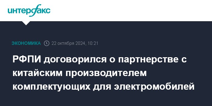Москва. 22 октября. INTERFAX.RU - Российский фонд прямых инвестиций договорился о партнерстве с крупным разработчиком и производителем комплектующих для электромобилей из Китая, сообщил фонд.