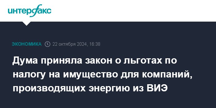 Москва. 22 октября. INTERFAX.RU - Госдума приняла в третьем чтении закон, который с 2025 г. освобождает от налога на имущество ряд объектов системообразующих территориальных сетевых организаций, а также солнечные электростанции компаний, производящих электроэнергию из возобновляемых источников энергии (ВИЭ).