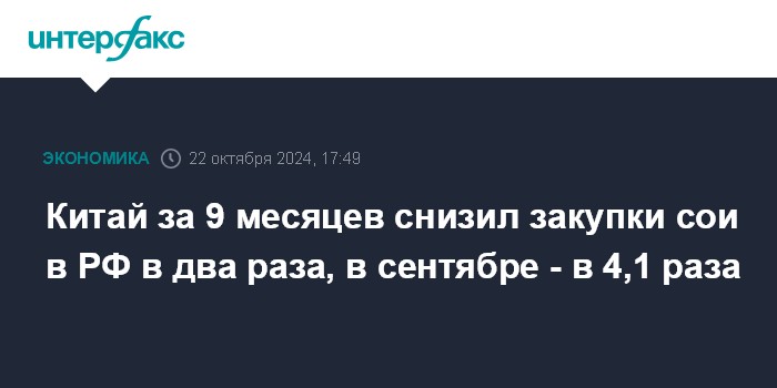 В сентябре этого года поставки российской сои в КНР упали до $11,4 млн с $47,1 годом ранее (в 4,1 раза).