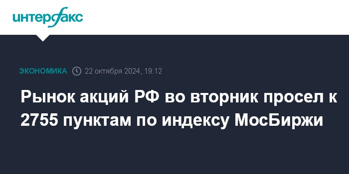 Рынок акций РФ во вторник просел к 2755 пунктам по индексу МосБиржи