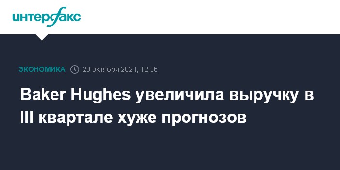 Москва. 23 октября. INTERFAX.RU - Американская нефтесервисная компания Baker Hughes Co. увеличила чистую прибыль почти в полтора раза в третьем квартале, однако рост выручки составил всего 4% и оказался хуже ожиданий аналитиков.