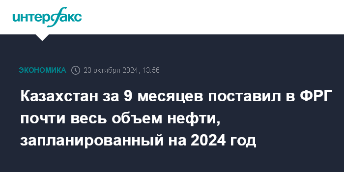 Казахстан за 9 месяцев поставил в ФРГ почти весь объем нефти, запланированный на 2024 год