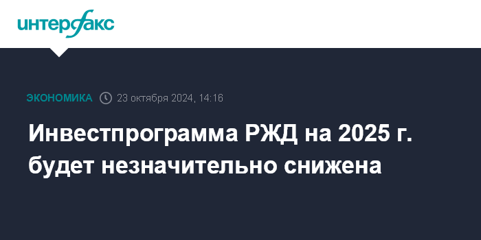 В сентябре первый замминистра транспорта Валентин Иванов сообщал журналистам, что министерство ожидает инвестпрограмму РЖД в 2025 г. на уровне 2024 г. "Мы считаем, что объем инвестпрограммы должен быть аналогичным как в этом году. У нас порядка 1 (трлн руб. - ИФ) с небольшим там было", - сказал он.