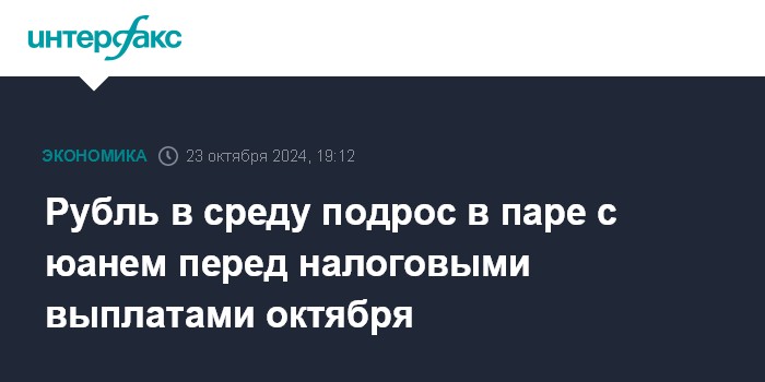 Москва. 23 октября. INTERFAX.RU - Китайский юань подешевел на Московской бирже по итогам торгов в среду. Рубль подрос в рамках подготовки экспортеров к налоговым выплатам октября. В понедельник, 28 октября, им предстоит перечислить в бюджет налог на прибыль, НДС, НДФЛ, акцизы, страховые взносы и НДД.