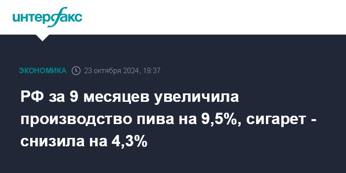 РФ за 9 месяцев увеличила производство пива на 9,5%, сигарет - снизила на 4,3%