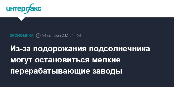 Москва. 24 октября. INTERFAX.RU - Рост цен на подсолнечник из-за снижения его урожая в этом году может привести к остановке перерабатывающих заводов, прежде всего малых и средних, ожидает исполнительный директор Масложирового союза Михаил Мальцев. Он сказал это на конференции "Российское растениеводство".