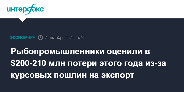 Москва. 24 октября. INTERFAX.RU - Рыбная отрасль РФ в этом году лишится порядка $200-210 млн из-за действия экспортных курсовых пошлин, считает президент Всероссийской ассоциации рыбопромышленников (ВАРПЭ) Герман Зверев.