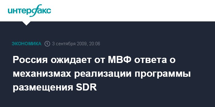 Москва. 3 сентября. INTERFAX.RU – Россия не будет участвовать в программе размещения специальных прав заимствования (SDR) Международного валютного фонда, пока не получит ответов на все интересующие ее вопросы, но не закрывает для себя дверь для участия в этом проекте, заявил помощник президента РФ Аркадий Дворкович.