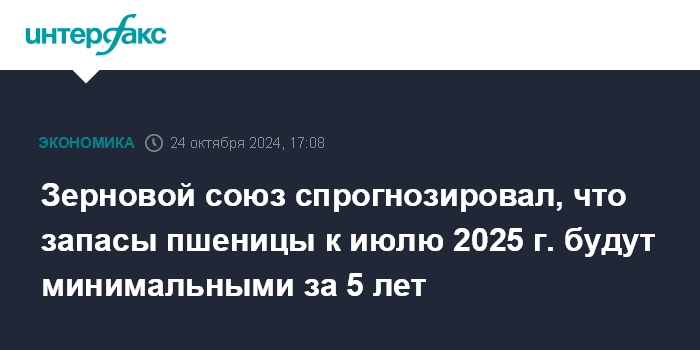 Москва. 24 октября. INTERFAX.RU - Переходящие запасы пшеницы в РФ к началу нового сельхозгода (к 1 июля 2025 года) будут минимальными за последние пять лет, прогнозирует директор аналитического департамента Российского зернового союза Елена Тюрина.