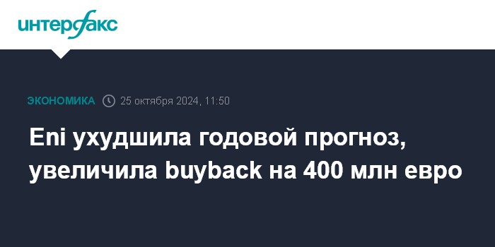 Москва. 25 октября. INTERFAX.RU - Итальянская нефтегазовая компания Eni SpA в третьем квартале 2024 года сократила чистую прибыль на 73% и ухудшила годовые прогнозы, однако увеличила объем программы выкупа акций на 400 млн евро.