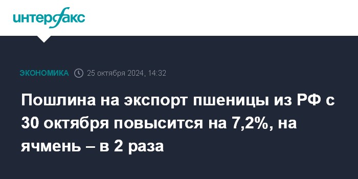 Пошлина на экспорт пшеницы из РФ с 30 октября повысится на 7,2%, на ячмень – в 2 раза