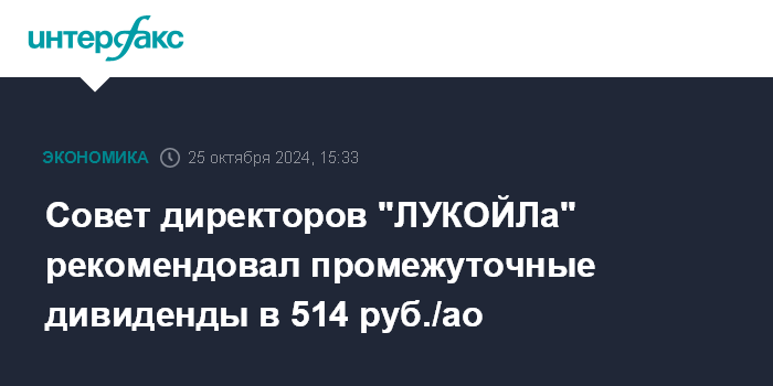 Совет директоров "ЛУКОЙЛа" рекомендовал промежуточные дивиденды в 514 руб./ао