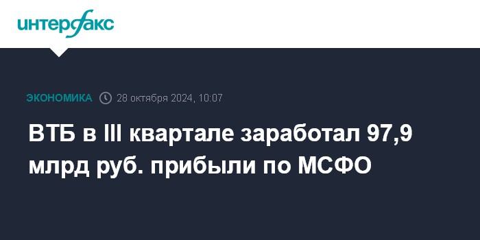 ВТБ в III квартале заработал 97,9 млрд руб. прибыли по МСФО