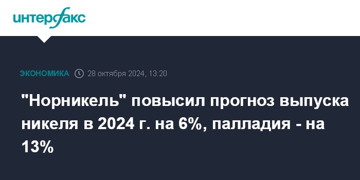 Москва. 28 октября. INTERFAX.RU - "Норильский никель" в связи с более быстрым завершением ремонта печи взвешенной плавки на Надеждинском металлургическом заводе повысил прогноз производства металлов из российского сырья на 2024 год, говорится в сообщении компании.