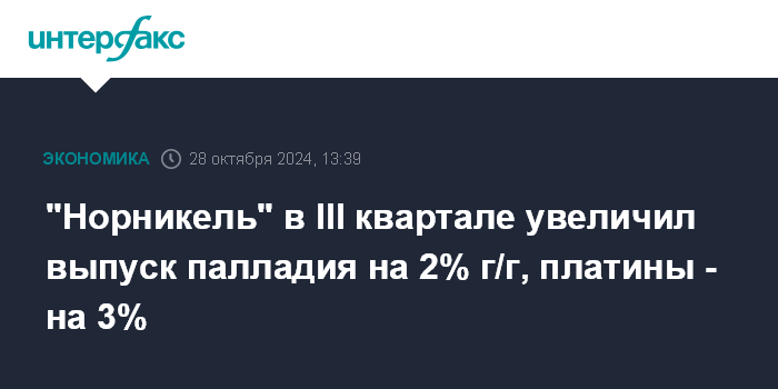 "Норникель" в III квартале увеличил выпуск палладия на 2% г/г, платины - на 3%
