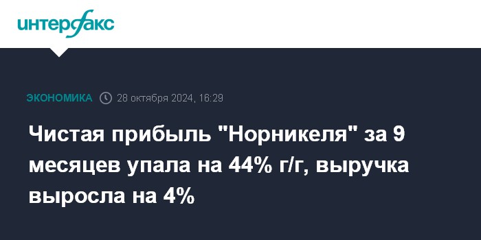 Чистая прибыль "Норникеля" за 9 месяцев упала на 44% г/г, выручка выросла на 4%