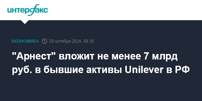 Москва. 29 октября. INTERFAX.RU - Группа "Арнест", купившая в октябре компанию "Юнилевер Русь" (бывшее подразделение Unilever в РФ), планирует вложить в нее не менее 7 млрд рублей. Это предусмотрено инвестиционным планом, который рассчитан на 2024-2026 годы, сообщает газета "Ведомости" со ссылкой на владельца и президента группы Алексея Сагала.