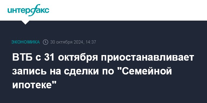 Москва. 30 октября. INTERFAX.RU - ВТБ с 31 октября временно приостанавливает запись на сделки по программе "Семейной ипотеки", говорится в сообщении госбанка.