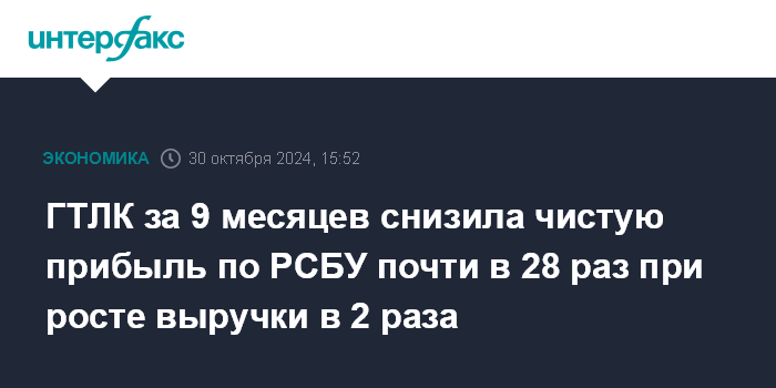 ГТЛК за 9 месяцев снизила чистую прибыль по РСБУ почти в 28 раз при росте выручки в 2 раза