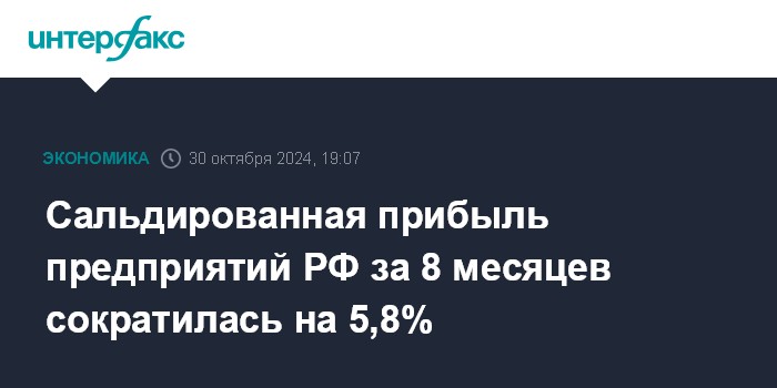 Сальдированная прибыль предприятий РФ за 8 месяцев сократилась на 5,8%