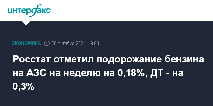 Москва. 30 октября. INTERFAX.RU - В России с 22 по 28 октября потребительские цены на бензин выросли по сравнению с предыдущей неделей на 0,18% после повышения на 0,17% с 15 по 21 октября и на 0,09% с 8 по 14 октября, сообщил Росстат.