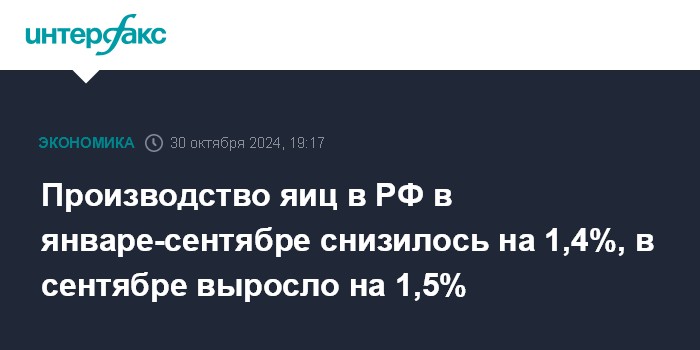 Производство яиц в РФ в январе-сентябре снизилось на 1,4%, в сентябре выросло на 1,5%
