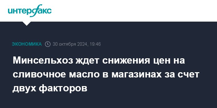 Москва. 30 октября. INTERFAX.RU - Минсельхоз рассчитывает, что начавшееся снижение цен на сливочное масло в оптовом звене, а также поставки из-за рубежа в перспективе приведут к падению цен в рознице.