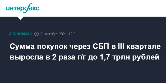 Сумма покупок через СБП в III квартале выросла в 2 раза г/г до 1,7 трлн рублей