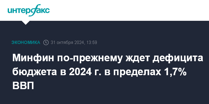 Минфин по-прежнему ждет дефицита бюджета в 2024 г. в пределах 1,7% ВВП