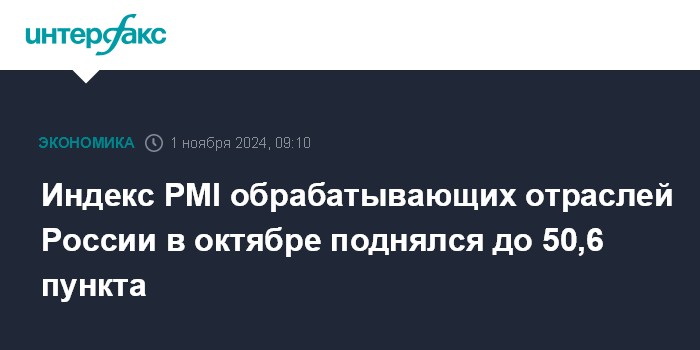 Москва. 1 ноября. INTERFAX.RU - В октябре индекс PMI обрабатывающих отраслей России составил 50,6 пункта, поднявшись с сентябрьских 49,5 пункта, показало исследование S&P Global.