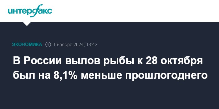 Москва. 1 ноября. INTERFAX.RU - Российские рыбаки к 28 октября выловили 4,2 млн тонн рыбы и других водных биоресурсов, что на 8,1% меньше, чем на аналогичную дату 2023 года, сообщается в материалах Росрыболовства.