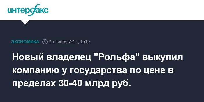 Новый владелец "Рольфа" выкупил компанию у государства по цене в пределах 30-40 млрд руб.
