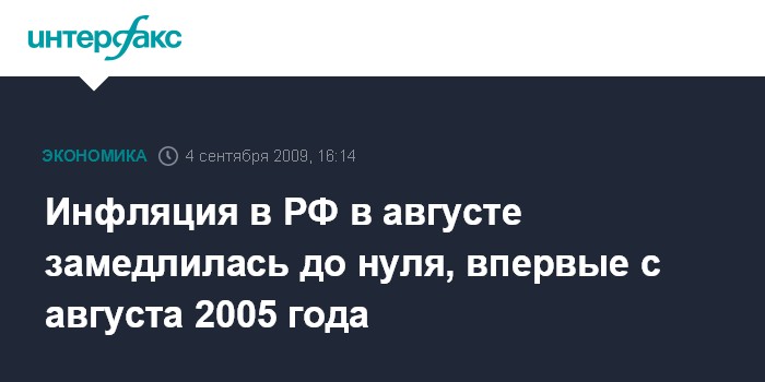 Москва. 4 сентября. INTERFAX.RU – Инфляция в России в августе 2009 г. замедлилась до нуля после роста по 0,6% в месяц в мае-июле 2009 года, сообщила в пятницу Федеральная служба государственной статистики (Росстат).