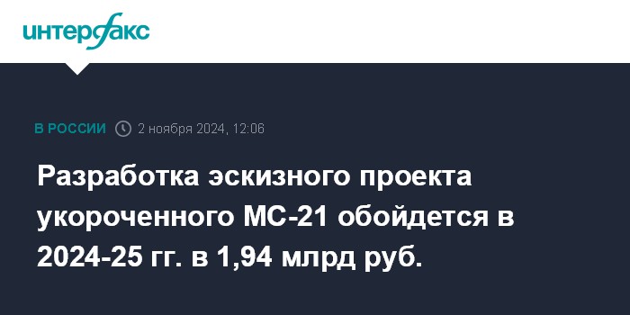 Москва. 2 ноября. INTERFAX.RU - Разработка эскизного проекта укороченной модификации самолета МС-21-210 обойдется в 2024-2025 гг. в 1,94 млрд руб., следует из проекта постановления правительства, опубликованного на портале regulation.gov.ru.