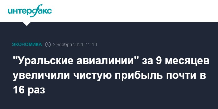 Москва. 2 ноября. INTERFAX.RU - Авиакомпания "Уральские авиалинии" в январе-сентябре 2024 года увеличила чистую прибыль по РСБУ в 15,6 раза по сравнению с показателем аналогичного периода прошлого года – до 18,228 млрд рублей, говорится в отчетности авиакомпании.