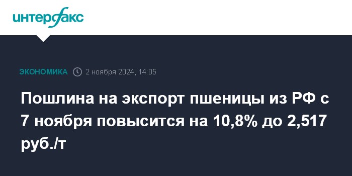 Москва. 2 ноября. INTERFAX.RU - Ставка пошлины на экспорт пшеницы из РФ с 7 ноября повысится на 10,8% до 2 тыс. 517 рублей за тонну с 2 тыс. 227,9 рубля неделей ранее, сообщает Минсельхоз.