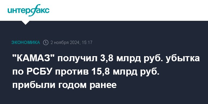 Москва. 2 ноября. INTERFAX.RU - Чистый убыток ПАО "КАМАЗ" по РСБУ за январь-сентябрь 2024 года составил 3,8 млрд рублей против прибыли 15,8 млрд рублей в аналогичном периоде прошлого года, сообщила компания.