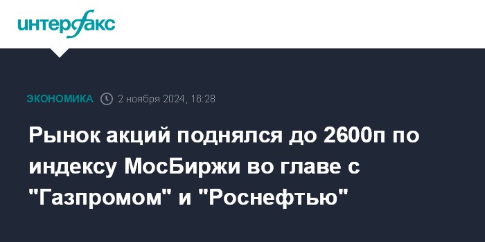 Рынок акций поднялся до 2600п по индексу МосБиржи во главе с "Газпромом" и "Роснефтью"