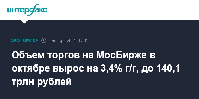 Объем торгов на МосБирже в октябре вырос на 3,4% г/г, до 140,1 трлн рублей