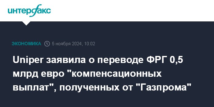 Москва. 5 ноября. INTERFAX.RU - Германская компания Uniper сообщила о переводе властям ФРГ порядка 0,5 млрд евро "компенсационных выплат" в рамках претензий за якобы недопоставки газа к "Газпрому", говорится в отчете Uniper.